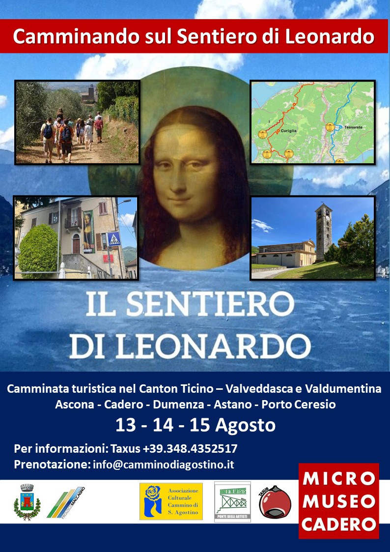 Domenica 13 Agosto 2023, in sinergia con Taxus APS e il Micro Museo di Cadero e al fine di valorizzare ulteriori luoghi legati alla memoria leonardesca, il Sentiero di Leonardo sarà arricchito da una peculiare estensione: verrà inaugurato un nuovissimo itinerario alternativo da Maccagno con Pino e Veddasca a Ponte Tresa passando da Cadero, Curiglia, Dumenza e Astano; saranno ulteriori 45 km di sentiero da percorrersi idealmente in tre tappe (13-14-15 Agosto. Su questa nuova estensione, le testimonianze di Leonardo da Vinci si legano innanzitutto alla figura del suo grande allievo Bernardino Luini (nato a Dumenza), ma poi anche al ladro della Gioconda nel Museo del Louvre Vincenzo Peruggia (nato anche lui in quella medesima località), ricordato in particolare nel Micro Museo di Cadero dedicato alla Gioconda e al furto d’arte più celebre al mondo. Grazie a questa aggiunta, sul Sentiero si viene così a configurare un nuovissimo vero e proprio Tour Leonardesco Lombardo-Ticinese della lunghezza totale di circa 120 km, da percorrere in sei tappe.